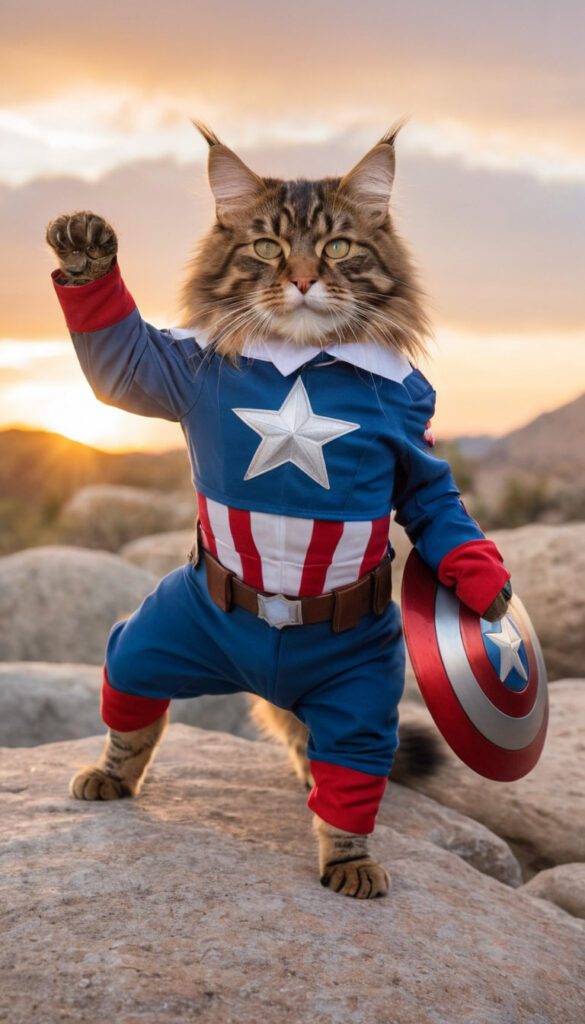 A symbol of bravery and loyalty, Captain Ameri-Cat carries his iconic shield and wears his red, white, and blue suit with pride. This patriotic kitty will stop at nothing to protect his fellow felines and stand up for justice.