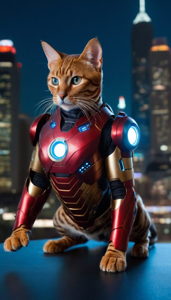 This high-tech feline genius wears a sleek red-and-gold suit powered by his glowing arc reactor. Iron Cat is bold, brash, and brilliant, always ready to fly into action and save the day with his innovative gadgets.