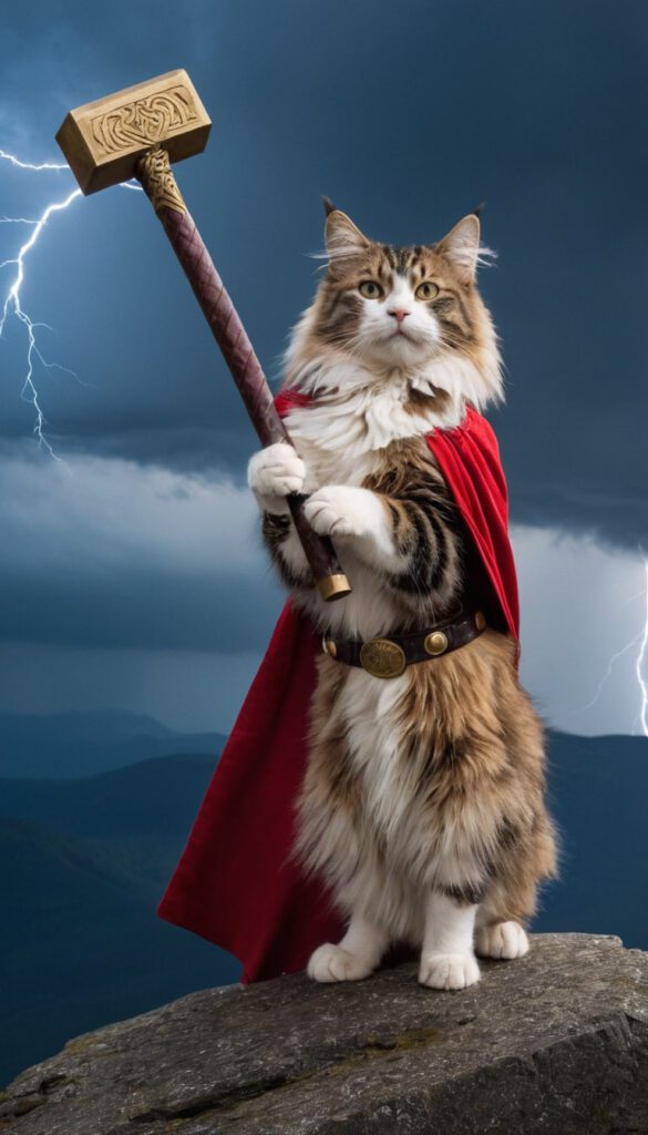 The mighty Thor Paw-son wields his enchanted hammer, channeling the power of thunder to protect his realm. With his flowing fur and commanding presence, this feline god is truly worthy of his heroic title.