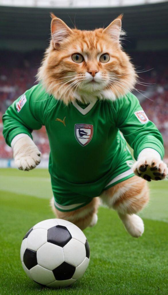 This furry champion dives across the goal line like a pro! Wearing tiny goalkeeper gloves and a determined expression, this cat is ready to block every shot that comes its way. Who needs a human goalie when you’ve got paws this quick?