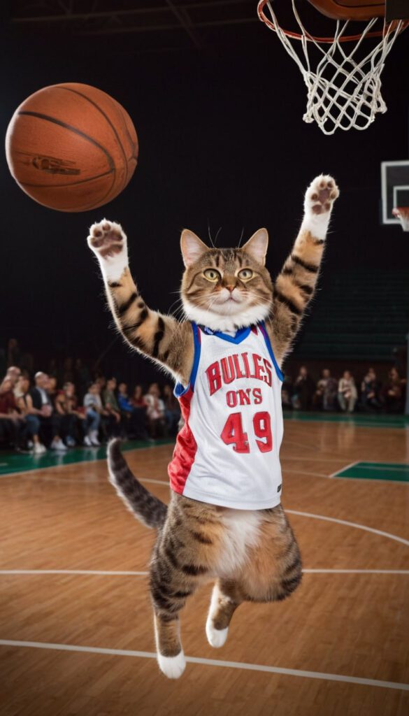 Watch out, NBA stars! This kitty is mid-air, perfectly executing a slam dunk. Sporting a miniature jersey and basketball shoes, this feline knows how to steal the spotlight. Who knew basketball could be this adorable?