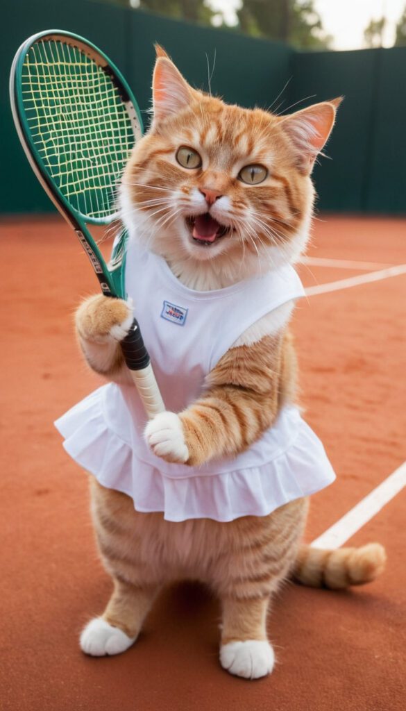 Game, set, match! Our tennis superstar cat is fully focused, holding a racket and preparing to smash the ball across the net. With its cute headband and sharp reflexes, this kitty’s backhand is unmatched.