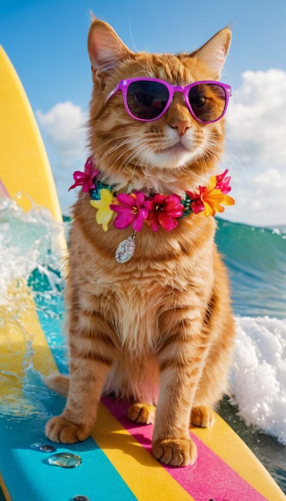 Cowabunga! Riding a wave like a pro, this adventurous cat balances perfectly on a colorful surfboard. With its wet fur glistening under the sun and tiny sunglasses, this is one cool surfer you don’t want to miss.