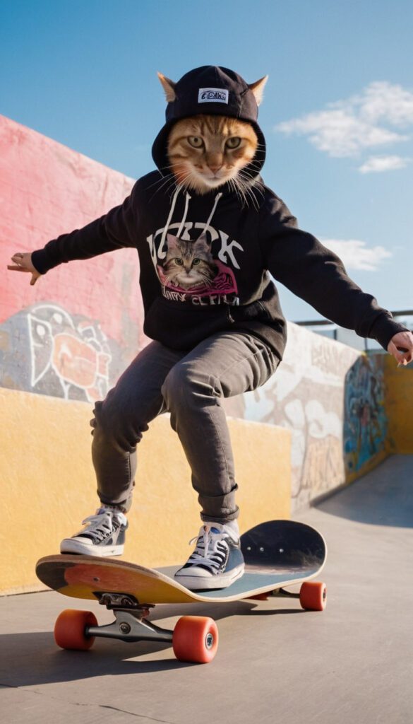This kitty shreds the skatepark like a legend! Dressed in a tiny hoodie and cap, our feline skater nails a perfect kickflip mid-air. Who says cats can’t be street cool?