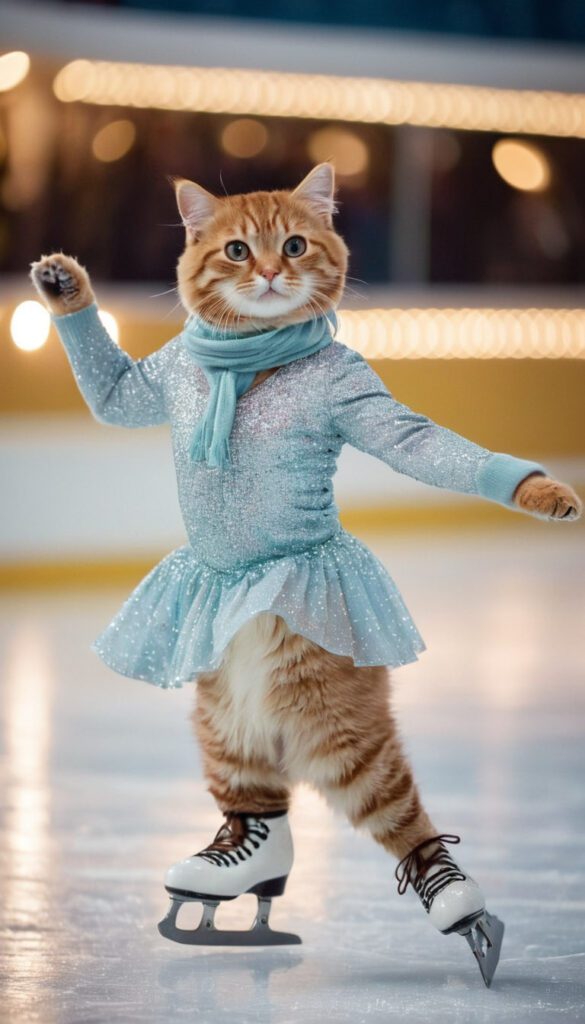 Graceful and elegant, this cat glides across the ice rink wearing tiny skates and a shimmering outfit. Performing a perfect pirouette, this feline athlete brings style and charm to figure skating. It’s a 10/10 performance!