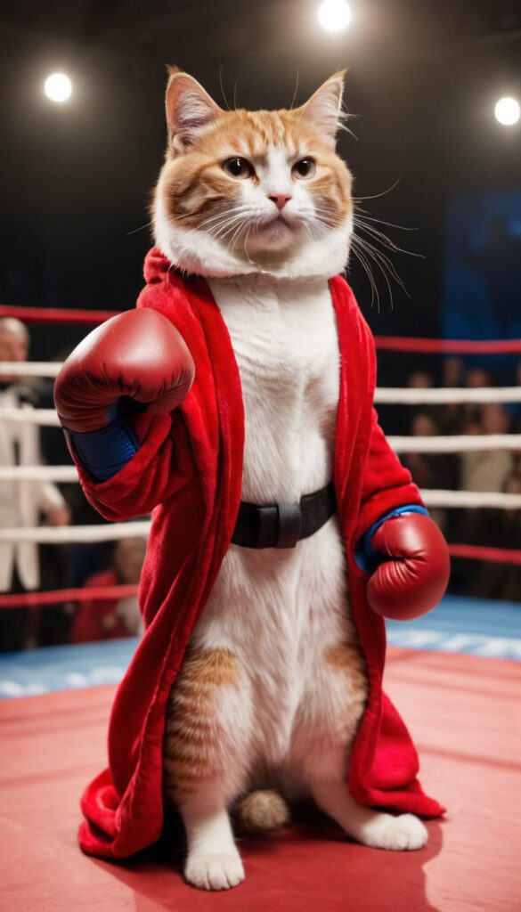 In the blue corner, we have the toughest kitty in town! Sporting mini boxing gloves and a determined stare, this feline is ready to throw some punches (adorably, of course). Who’s ready for a purr-fect knockout?