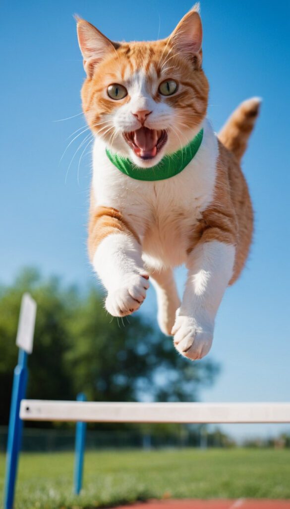 Speed and precision define this athletic kitty as it leaps over hurdles effortlessly. Wearing a sports jersey and running shoes, it proves that nothing can stop a determined cat on the track!