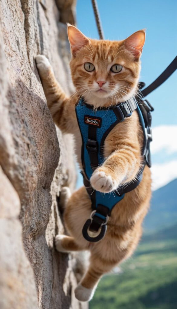 Scaling new heights, this adventurous cat climbs the rock wall with ease. Equipped with a tiny harness and climbing gear, its focused expression shows it’s ready to conquer any summit.